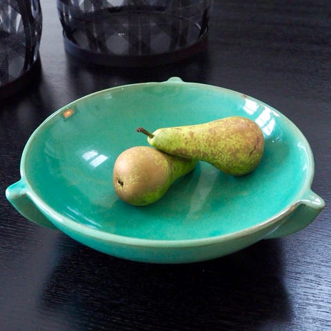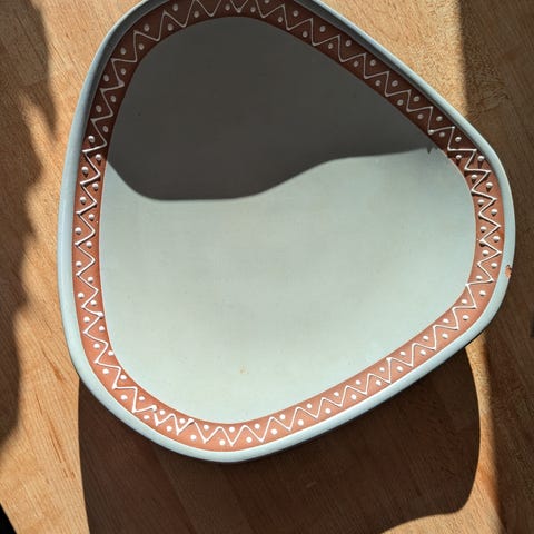 Handmade in Norway. 60-tallet. .? . (Vet ikke helt. )Dia 27 cm. Høyde 10.5cm. Pent. Men noen riper ( se bilder ) i glasuren. Synes krakelert under når fuktig (vaskes). Har mer i samme serien. Kjøper betaler porto.