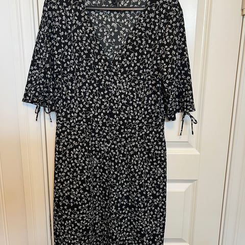 Lett sommerkjole i str L, passer en str. 38/40 i krøllfri kvalitet, Kjolen kan rynkes sammen på armen og har knepping foran (trekte knapper som på kjolen) Lengde 95 cm.