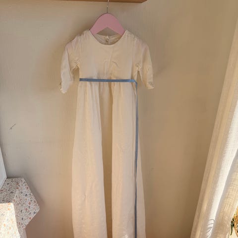 Dåpskjole i glinsende grått/sølvstoff og offwhite. Lengde 114 cm. 2 - 4 måneder.