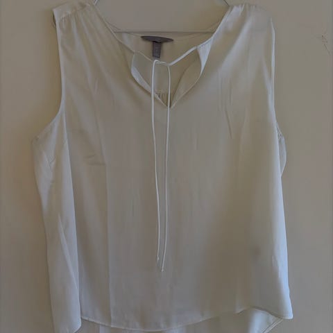 Hvit topp, h&m, str 34, litt lengre bak enn foran, fin detalj i ryggen(se bilde), brukt en gang( litt stor til meg), selges kr 30,- Hentes sentralt Tromsø. Kan sendes som vanlig brevpost mot betaling av porto. Ikke fix-ferdig.