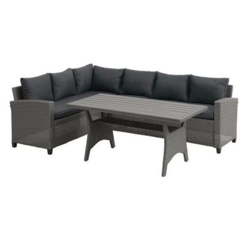 Leveransen inkluderer 1 hjørnesofa, 2 sentersofaer, 2 krakker, 1 salongbord og 9 puter. MerkVi anbefaler deg å dekke til settet når det er regn, snø og frost.
