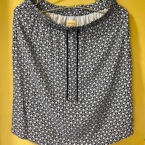 Skjørt med en liten splitt foran. Lommer både foran og bak. Stretch i stoffet. Brukt et par ganger, som nytt. Reserveknapp følger med.