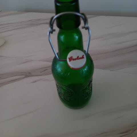 To flasker med keramikkork fra Grolsch. 26 cm høye. Aass-flasken på bildene er solgt. Kr. 60,- pr stk. kan sendes direkte fra meg for kr. 70,- i porto.