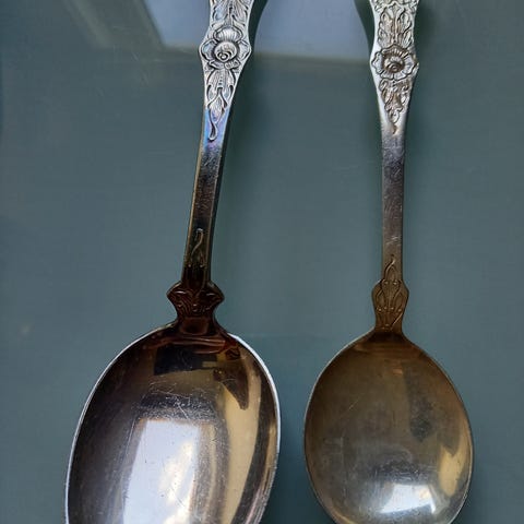 Sølv, 2stk. tekjeer veil. Gammel pris er 550kr, 240kr pr.stk. solgt:3 stk. spiseskjeer Flat rose i sølvplett. Bør hentes hos meg i Arendal. Frakt kommer i tillegg. Kan også gi akseptabelt bud. Foretrekker Vipps.