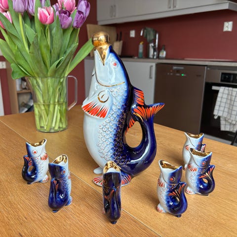 Porselen fisk karaffel med 6 snapsglass