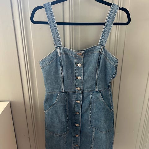 Jeanskjole med hängslen och knäppning fram från River Island. Materialet är stretch. Kan användas som oversized för en med strl. S. Sitter lite tightare för en med strl. M