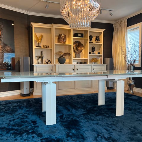 Solid og tidløst spisestuebord med bordbein i massivt tre og elegant bordplate i fasettslipt glass. Gir et luftig og luksuriøst uttrykk, samtidig som det er svært stabilt. God plass til selskap og hverdagsbruk.