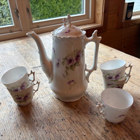 Porselenskanner, kaffekanner, stavhankkanner, porselensmugger, kopper, skåler, sukkerkopper m.m.