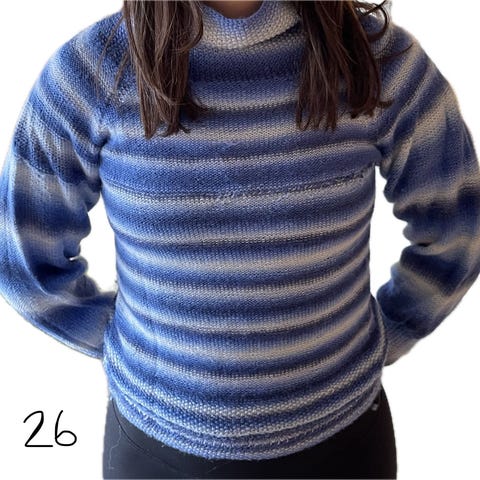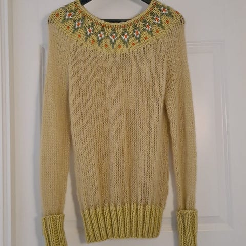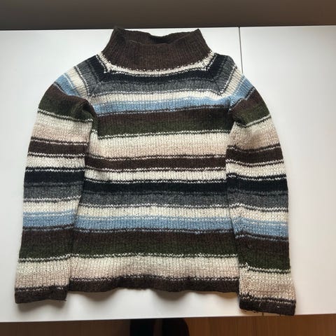 Har en fin hjemmestrikket ullgenser som ikke lenger blir brukt . Den har bare ligget i skapet i det senere å den har sin strl L