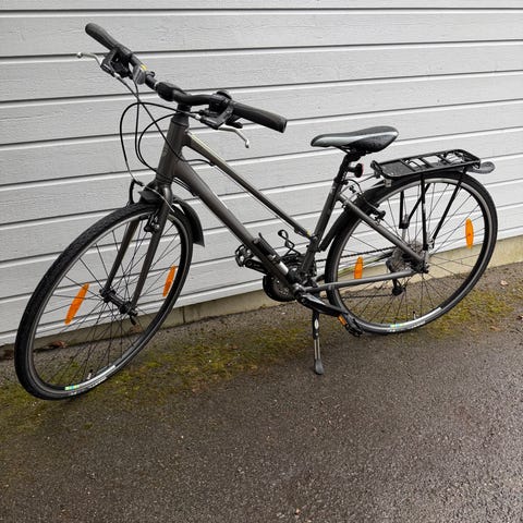 Det følger også med vinterdekk. Track-håndtak er festet på, gode å holde i når sykler i oppoverbakker! (Gummien rundt håndtak må skiftes, fåes kjøpt nye.) Det følger med lette plastskjermer, både foran og bak, om jeg ikke husker feil. Er med bagasjebrett, men kan taes av. Klikk(lås) pedaler til sykkelsko / klikksko på ene siden, vanlig pedaler på den andre siden. Metall pedaler uten plast.