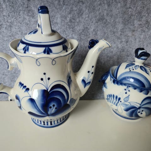 Håndmalt Delft kaffe-/tekanne med mugge og sukkerkopp