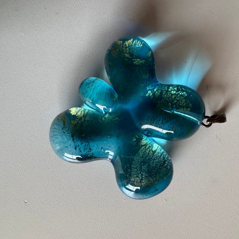 Stor brosje ,nål med farget grønn/ turkis glass i gull farge metall