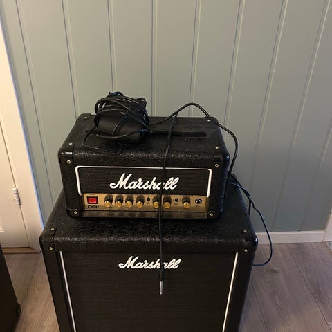 Marshall 4x12" kabinett. Model 8412 LEAD 4X12. Dette er modifisert med ekstra tilkobling slik at kabinettet er satt opp i stereo. Kan enkelt tilbakeføres til original stand. Kr. 2500,-