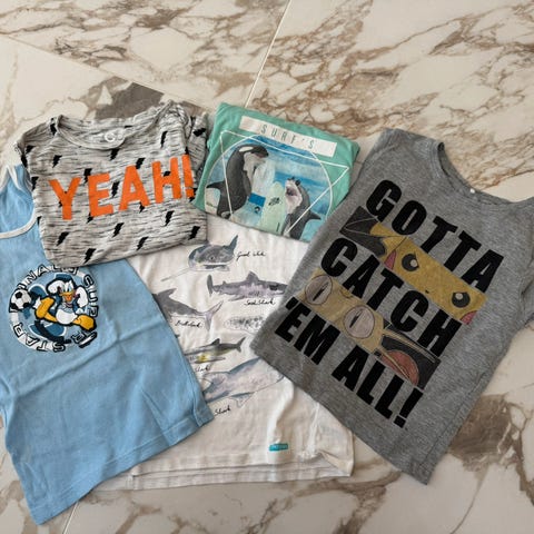 3 av t-skjortene er str. 110, resten er str. 110/116 og 116.