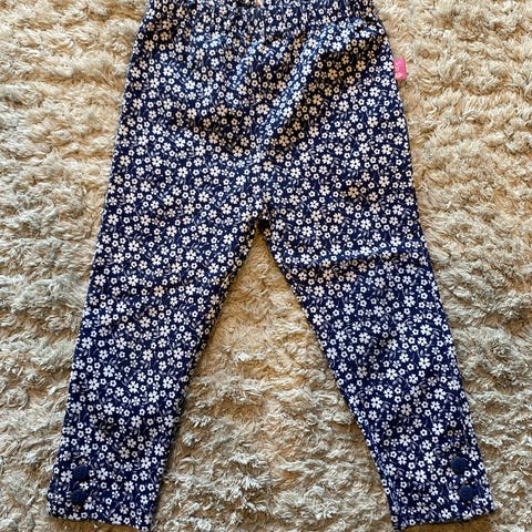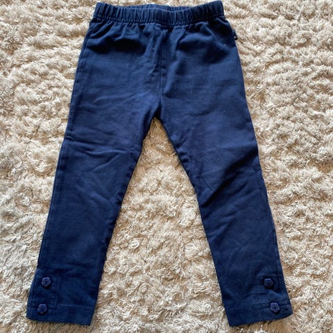 Pen mørkblå bukse med trykknapper og strikk til i stramming i livet. Selges med en blå og hvit stripete myk og god genser.
