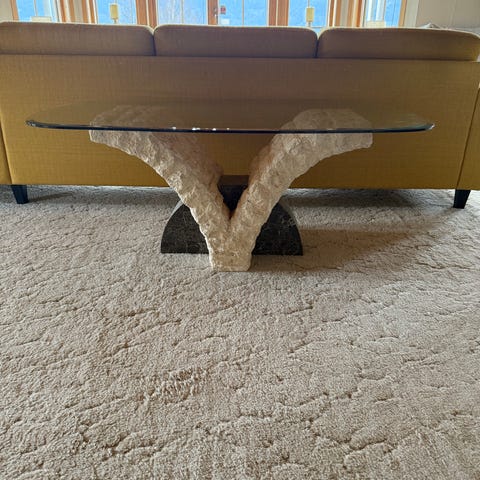 Kun laget ett, altså en ordentlig One Off. Er visstnok laget ifm. fagbrev som møbelsnekker. Base i tre med glass bordplate.