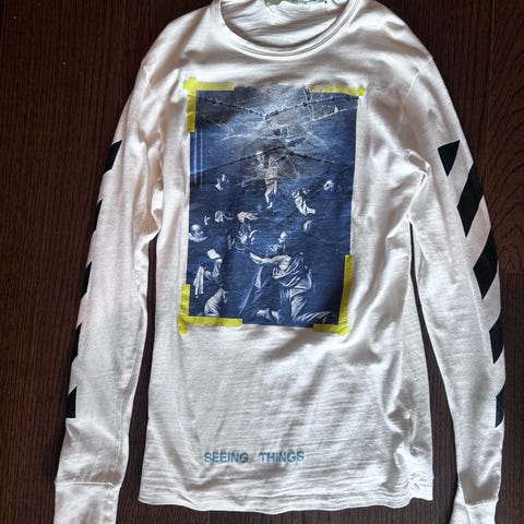 Splitter ny Off White "seeing things" longsleeve med tag og zip tie på. Ubrukt, kun prøvd på flere ganger. Selges fordi passformen blir for lang for meg. Størrelse XS. Mål kan sendes ved etterspørsel. Kjøpt på Matchesfashion noen år tilbake i tid. Kan leveres/hentes i Hønefoss etter avtale, all annen frakt betales av deg som kjøper. Sender gjerne med helt hjem, postnord eller posten etter ditt ønske. Fiks ferdig er også supert
