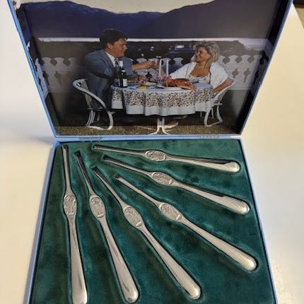 Pent brukte fruktkniver laget av Hardanger bestikk. Ligger i original eske. Se bilder for detaljer.