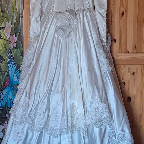 Den er kjøpt hos Mettes Brudedesign i Langesund i 2017. Den er sydd inn til å passe meg, men kan fint tilpasses på nytt. Det står at det er størrelse 46, men på den tiden brukte jeg vanlige klær i størrelse 42-44.