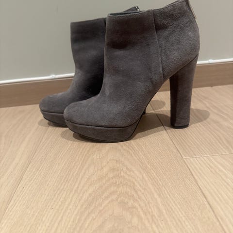 Høye skinn med slangeskinn hæl og såle. Semsket , glidelås bak . Str 9.5 , tilsvarer str 38