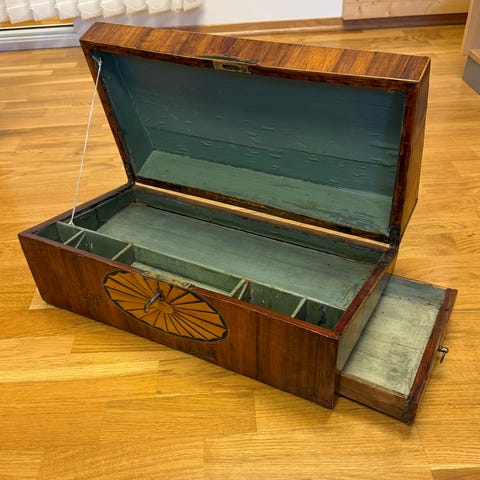Nydelig skrin i tre med lokk13 cm i diam og 7 cm høyde