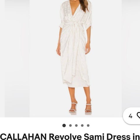 Hvit, fotsid kjole med halterneck. Flettet under byste. Stoff: 100% silkechiffon. Fór: 100% silkesateng.
