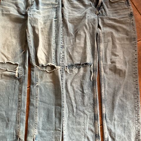Selger bukser fra Gina Tricot og Zara. Det er to bukser fra Gina Tricot. Den ene er mørkeblå i størrelse 27 og stretchy i stoffet. Den andre er lyseblå med slitt stil, størrelse 26 og litt mindre stretchy i stoffet. Den siste buksen er fra Zara. Den er svart med en slags skinnfølelse, stretchy i stoffet og i størrelse 36 (small). Alle buksene er veldig pent brukt (den svarte og mørkeblå er nesten som ny). Selges samlet for kun 100 kroner. Ta gjerne kontakt for spørsmål :-)