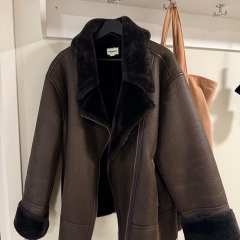 Laget av 100 % saueskinn. "Genuine Leather by MNG". Foring av 100 % polyester.