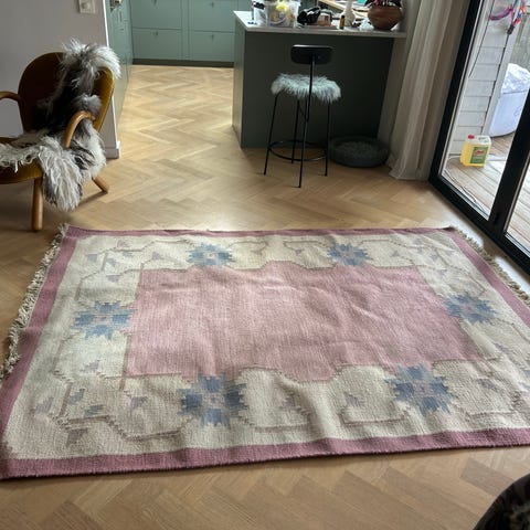 Teppe med rosa/lilla striper og hvite frynser mål 160*230. 2500kr