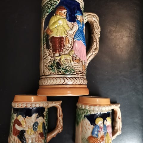 Keramikk krukke med tappekran + 4 krus + «Skulptur».