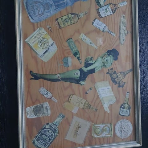 Gammelt, flott serveringsbrett med aleminiumskant og dekorativt motiv.