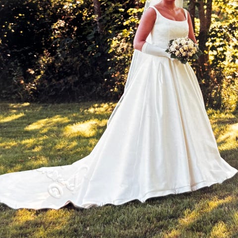 Nydelig St. Patrick brudekjole str. 38. Brukt en gang. Ferdig renset. Flotte detaljer i gull og perler på overdel og slep. Selges for 5000,- (kostet 23000, - som ny)