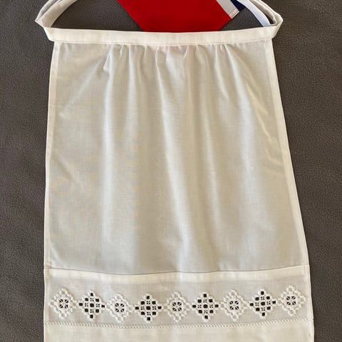 Forkle sydd i hvitt bomullstoff.