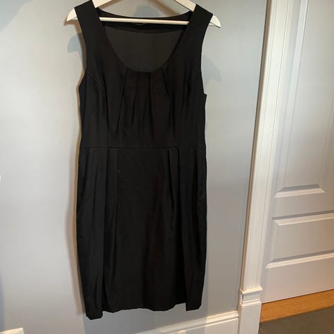 Svart enkel kjole i silkestoff med knytting bak i silkereim. Størrelse 38 fra cubus. Ingen defekter. Hentes på Alexander Kiellands plass eller sendes mot at frakt dekkes av kjøper.