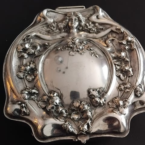 Ubeskrivelig vakker, antikk og stor vase i sølvplett med glassinnsats fra tyske designer CARL DEFFNER - ESSLINGEN , NECKAR (ca 1905)