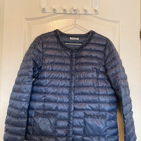 Nydelig tynn prikkete dunjakke med fine detaljer str S. Jakken er helt ny og koster kr 1799 i butikk