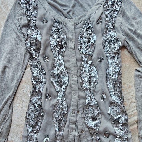 Pen kardigan med roseapplikasjoner.