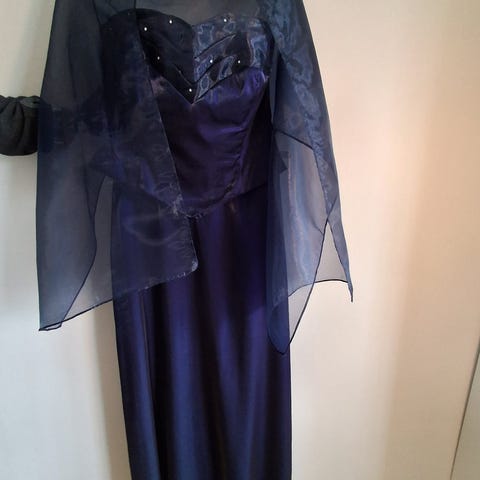 Kjolen er todelt, der overdelen kan utvides og strammes bak. Passer nok best til en med små bryst. Håndlaget sjal inkludert.
