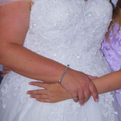 Nydelig offwhite brudekjole med fine detaljer. ( den er ikke to-delt )Bildene er tatt uten underskjørt, noe som vil gi mere volum på kjolen. Slep med små knapper, perlebroderier. Str 36/38. Lange hansker følger med om ønskelig.