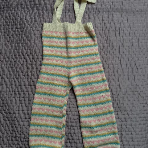 Hjemmestrikket hel dress i gult garn. Dressen er 55 cm lang + 6 cm buksefall nederst.