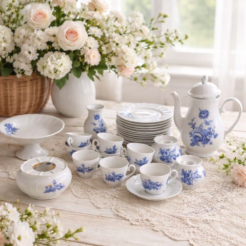 12 kopper m/skål og asjett 2 serveringsfat, sukkerskål og fløtemugge, kaffekanne og 12 teskjeer
