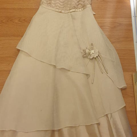 Brudepikekjole / selskapskjole i str 134 som er brukt kun 1 gang selges. Skjørtet har flere lag og med knyting bak i livet bak. Glidelås i ryggen.