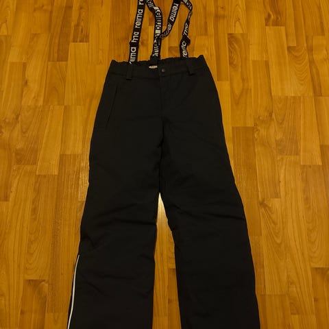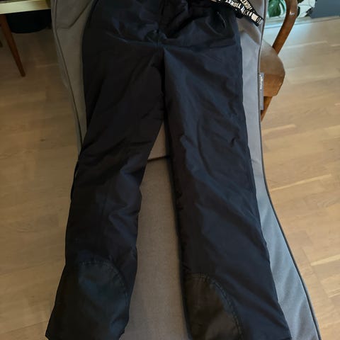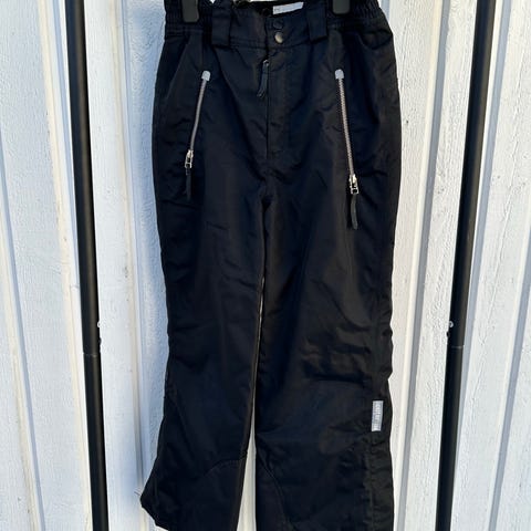 Svart skibukse fra Ticket to Heaven, str. 6 år/116 cm. Lengde 75 cm, bredde målt over linning 31 cm, med uttøyd strikk 34 cm. Beltestropper. Regulerbare seler (m/ryggstykke) som kan kneppes av. To frontlommer med glidelås. Nederst på bena er det glidelås og velcro-stramming ytterst, og et innerlag med strikk og velcro.