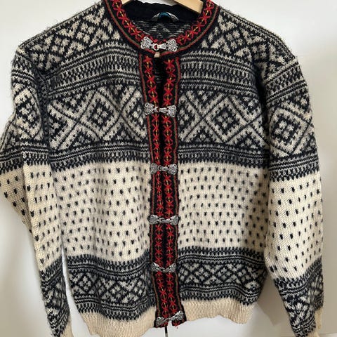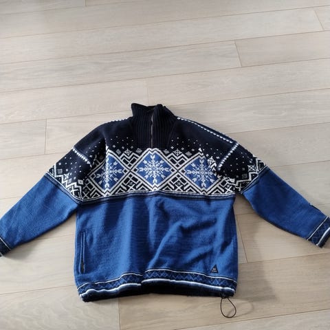 Ubrukt genserjakke fra Dale of Norway i 100% ull, litt stor i størrelsen. Ny pris 2799,- Lengde fra topp skuldersøm ca 68cm (liggende flatt), bredde ved rød brystsøm ca 108cm.