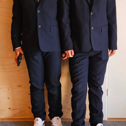 Dressen er mørk blå i flott kvalitet, 60 % ull,40% polyester. Dobbeltspent jakke med gullknapper, bukse med skrålommer i front, og en baklomme med knapp.