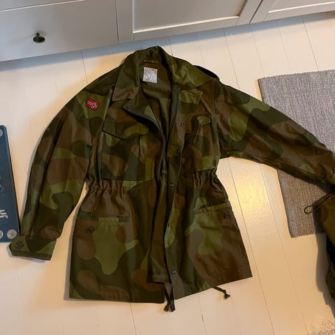 4. Tynn overtrekksjakke i bomull m/ knapp i str. Liten 128/75 cm (2) Ubrukt/ pent brukt kr. 150,- . Kan ha lagringsmerker.