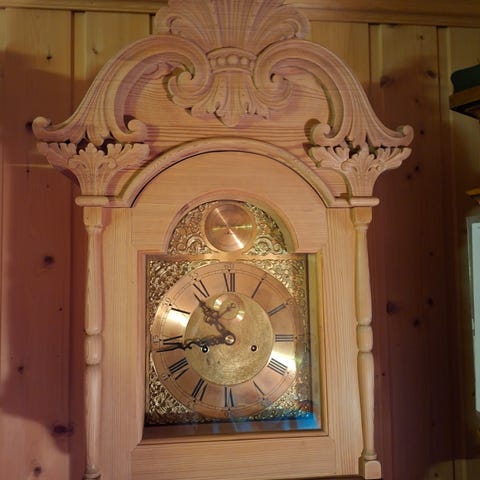 Majestetisk gulvklokke med utskjæringer utført av anerkjent treskjærer Arve Mosand