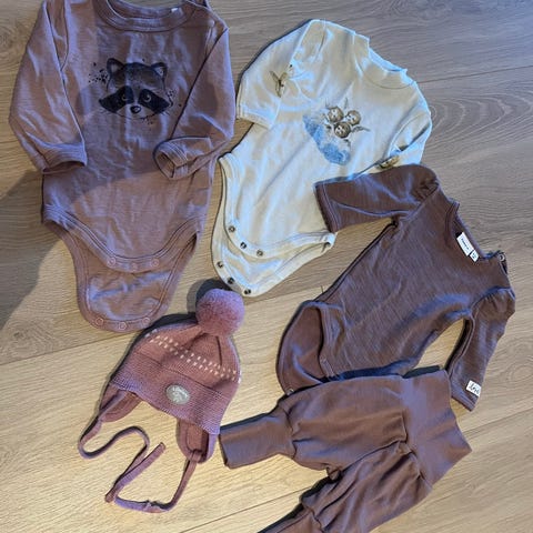 Selger et nydelig sett med ubrukt hjemmestrikket lue, skjerf og votter. Pent brukt body (Lindex)og bukse(Hust& Claire) str.62. Kan sende mot frakttillegg på 80kr