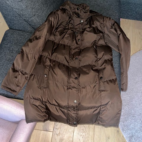 Lang beige boblejakke strL men er mer som en m. Merke er Byoung. Er brukt kanskje 2 ganger. Selges for 100 kr.