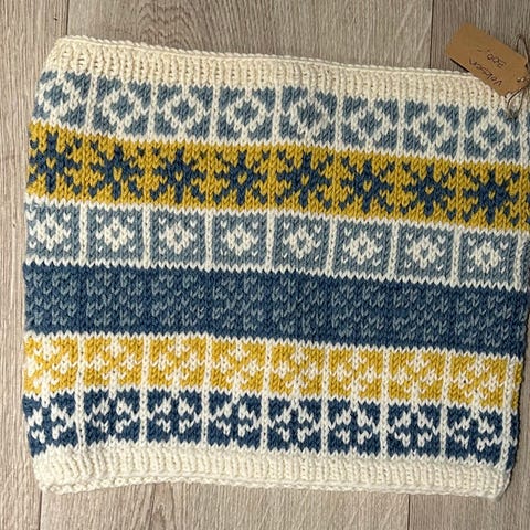 Stor rullehals fra Culture i finstrikk med ullblanding og innslag av moihar. Noe bredere nederst. Lekre farger, gull, hvit og lys grå. Mørkere grå midtstolpe med luftehull.